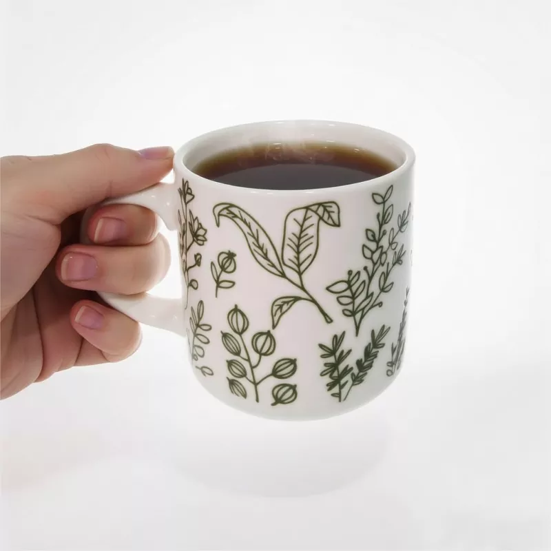 1. Esta caneca apresenta uma impressão botânica verde simples e natural como peça central visual: