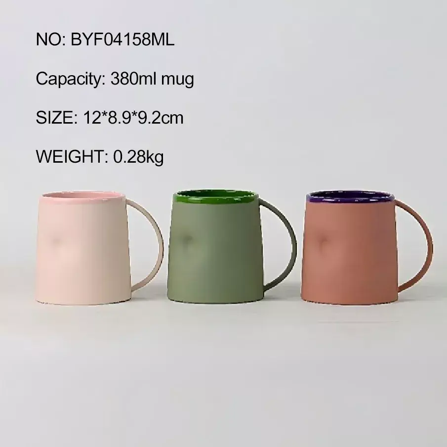 O modelo certo (BYF04158MS) vem em três tons pastel: cinza claro, bege e turquesa. Ele possui 270 ml, mede 11,5 x 8,7 x 6,7 cm e pesa 0,19 kg. Ambas as canecas são semelhantes em altura, incorporando um estilo fresco e elegante. O modelo esquerdo é um pouco maior e se mantém mais, permitindo que os clientes escolham o que melhor atende às suas necessidades.