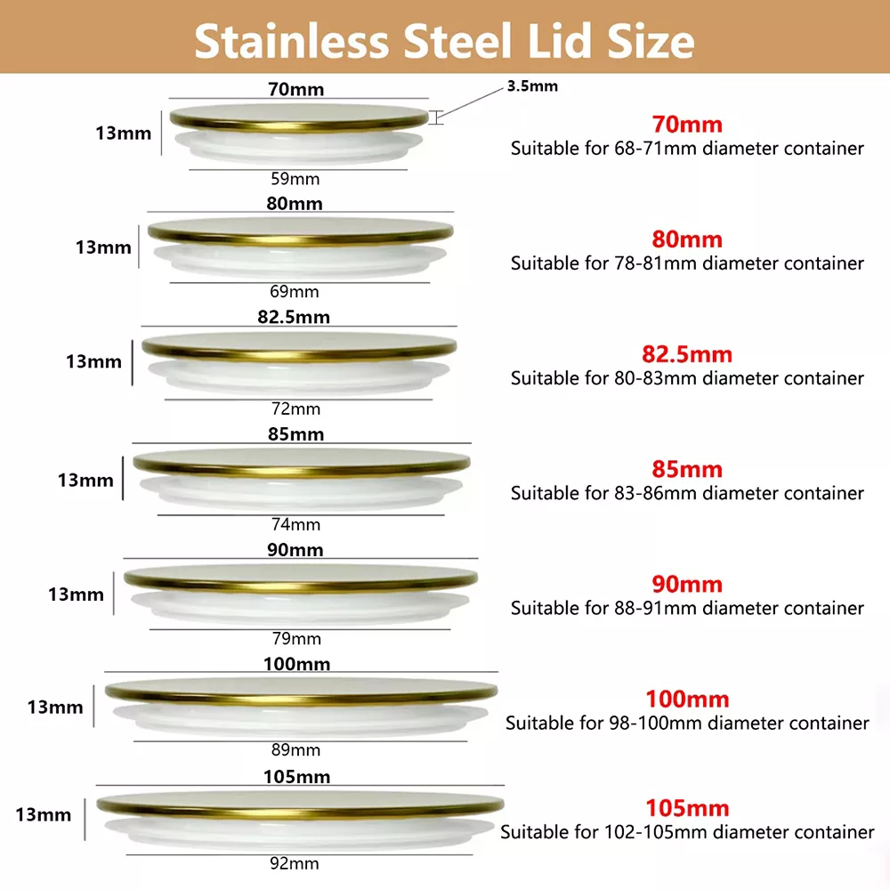 Nossas tampas de jarra de velas de aço inoxidável de serigrafia estão disponíveis em vários tamanhos, todos com uma altura geral de 13 mm. As dimensões específicas e as aberturas compatíveis de contêineres são mostradas abaixo:
