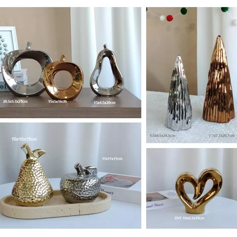 Decores de cerâmica especiais da BYF apresentam frutas, árvores de Natal e corações. Feito de cerâmica, eles utilizam uma técnica única para criar um brilho metálico, disponível em ouro e prata. Os projetos de frutas (maçã e pêra) apresentam linhas suaves, com recortes e texturas exclusivos; A árvore de Natal é tridimensional, com texturas ricas; E o coração é simples e elegante, emprestando um toque de romance. Essas peças elegantes e de luxo de luz são perfeitas para sua sala ou mesa, adicionando um toque de talento e estilo artístico à sua casa. Eles são acessórios refinados que aumentam o ambiente de qualquer espaço.